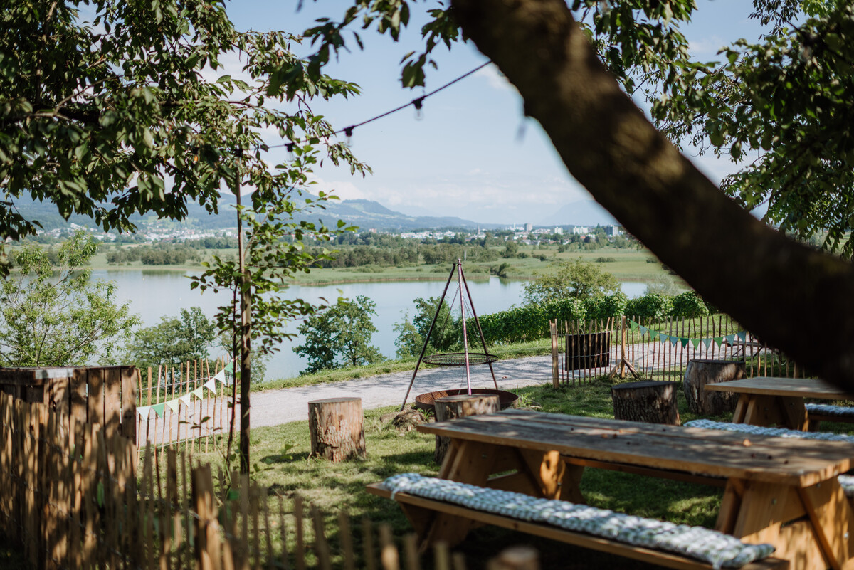 Auf den Grill kommen regionale und saisonale Spezialitäten vom Hof bei Lagerfeuerromantik mit Aussicht.