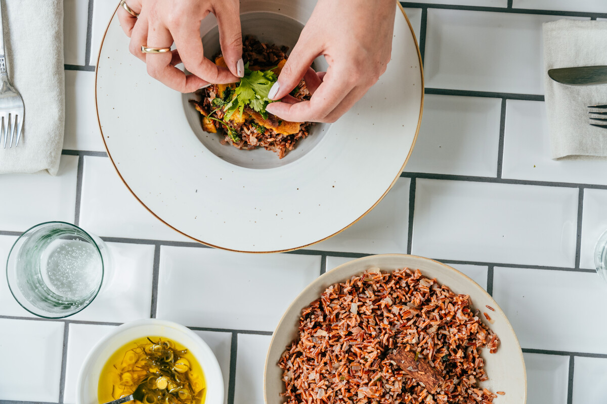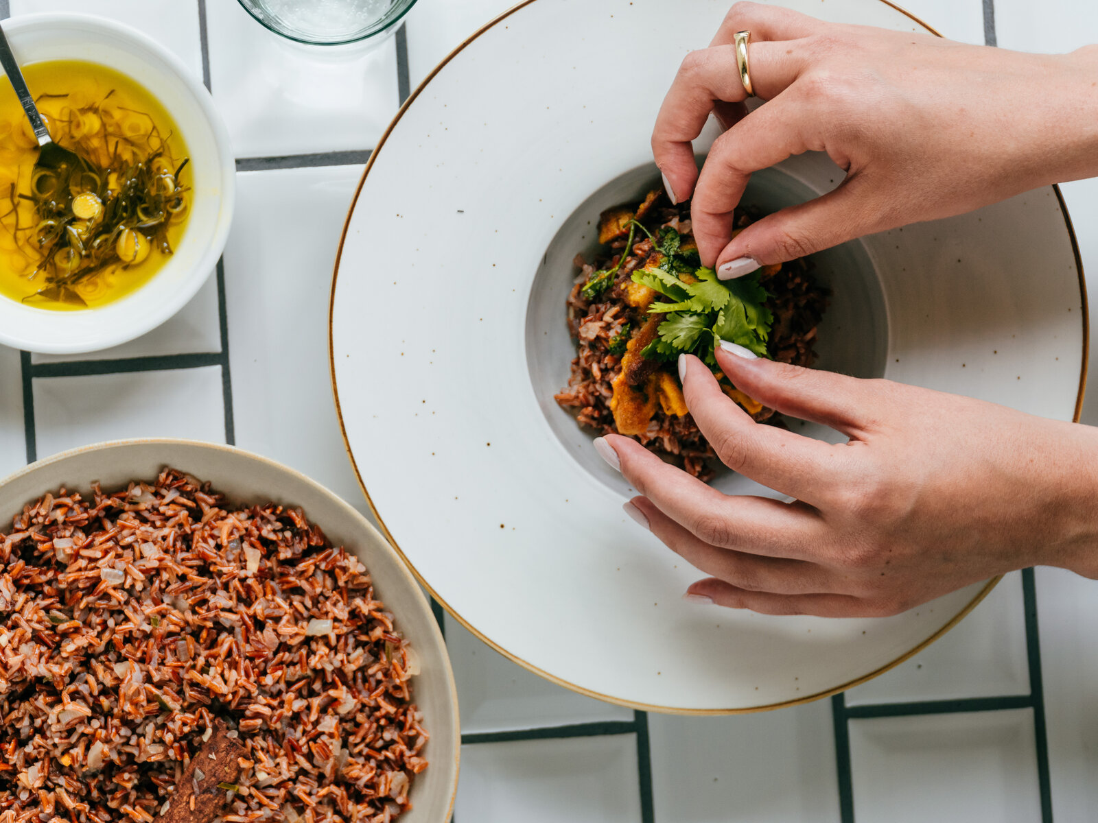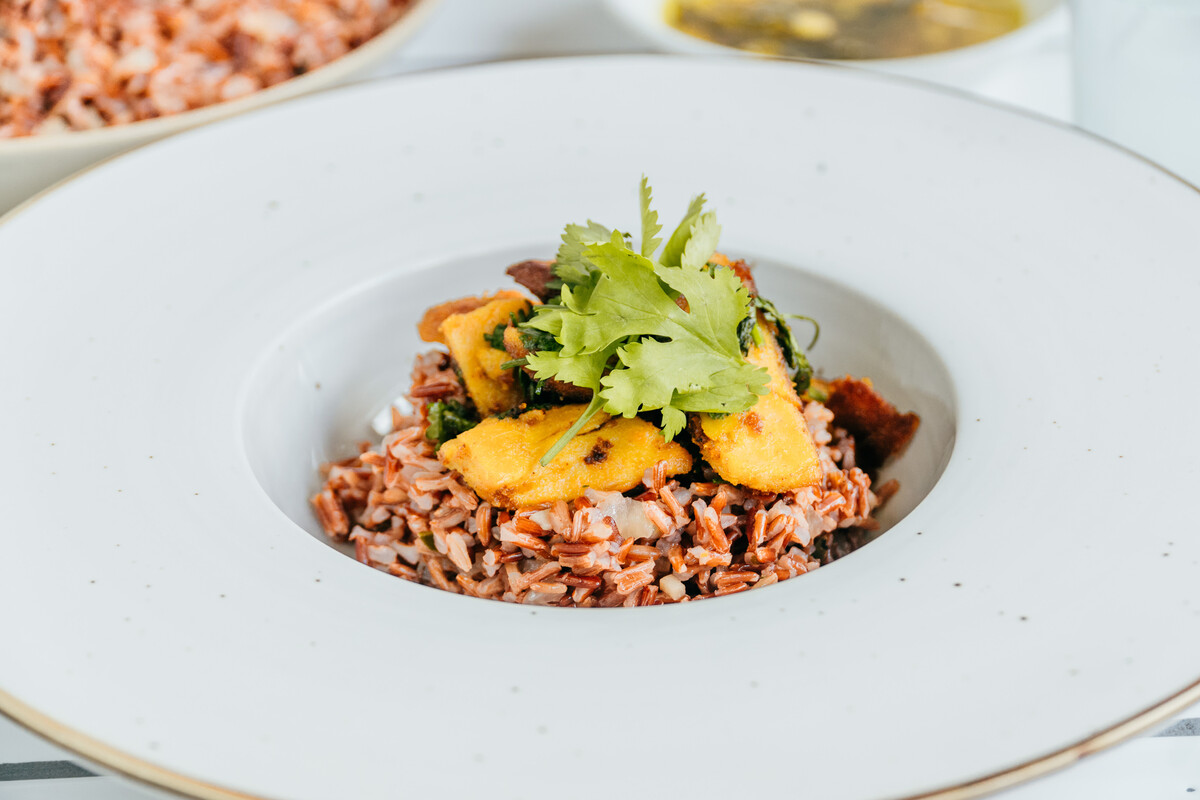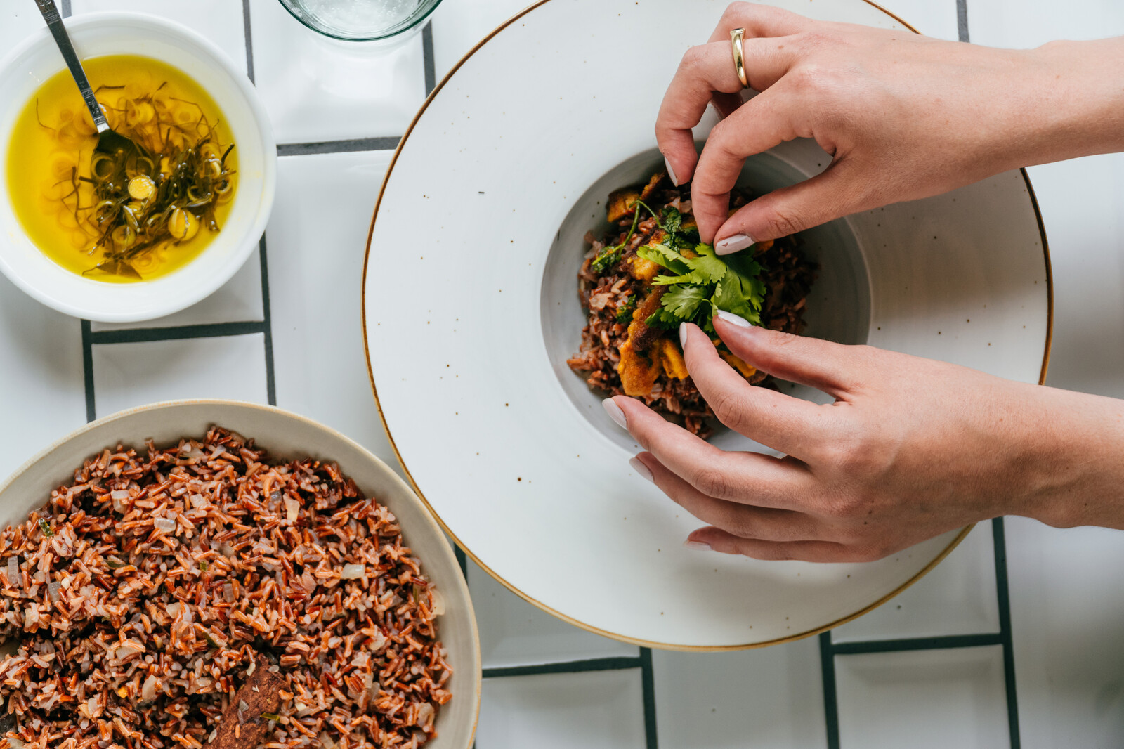 Den Reis auf die Teller verteilen, Planted darüber geben. Mit frischem Koriander und etwas Zitronenöl garnieren.