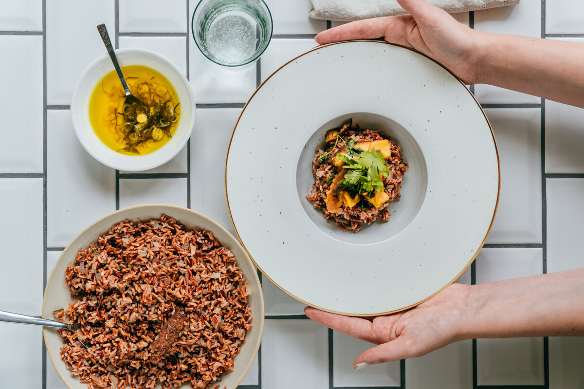 Für den Reis Zwiebeln, Knobli, Kaffirlimettenblätter, Loorbeer, Zimtstange, Nelken in Olivenöl andünsten. Den roten Reis dazugeben und auch kurz dünsten Bouillon, Ingwer und Zitronensaft dazugeben und aufkochen. Temperatur zurückstellen und Reis abgedeckt 30 Minuten köcheln lassen. Wenn der Reis bissfest ist, vom Herd nehmen und noch 10 Minuten nachziehen lassen.